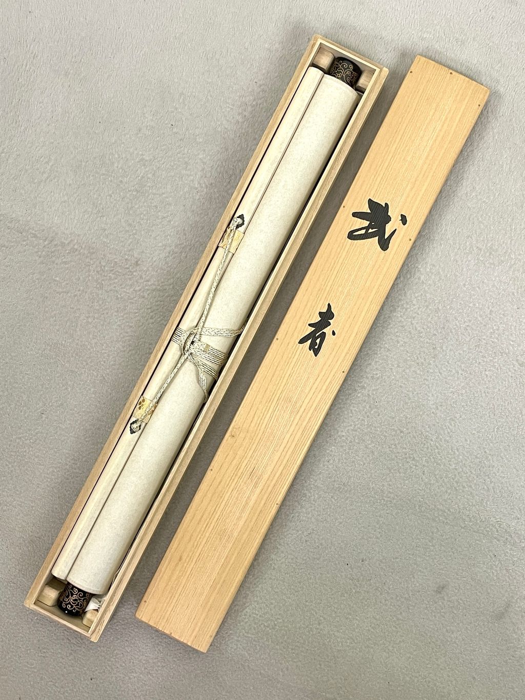 Mounted on a lacquered roller (漆軸), this hanging scroll (掛軸) is presented with a wooden box, emphasizing its value as both an artistic masterpiece and a collectible item. The silk medium enhances the vibrancy of the painting, while the lacquered roller adds a classic touch, elevating the overall presentation.