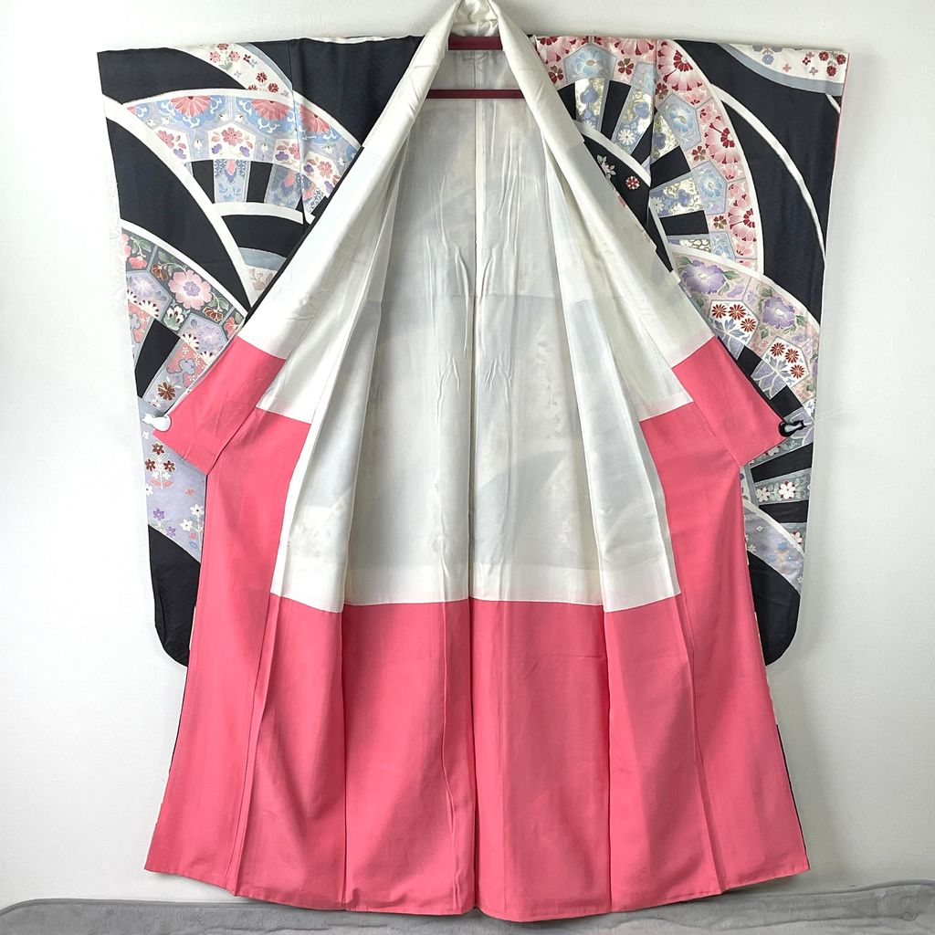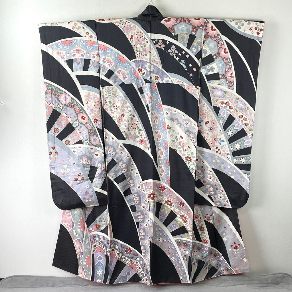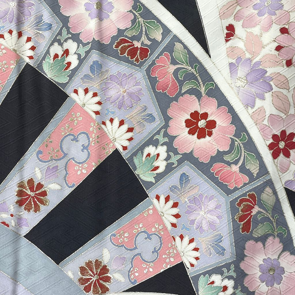 An elegant black furisode kimono crafted from luxurious pure silk, featuring a striking combination of floral and geometric patterns. The long sleeves and bold design make it ideal for formal occasions such as Coming-of-Age Day or wedding celebrations. A beautiful piece showcasing traditional Japanese artistry and textile craftsmanship.