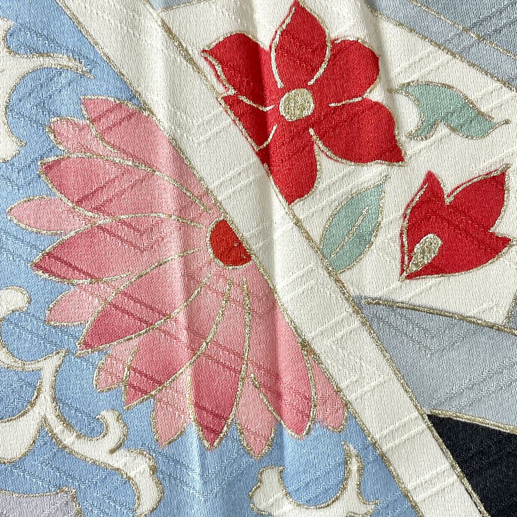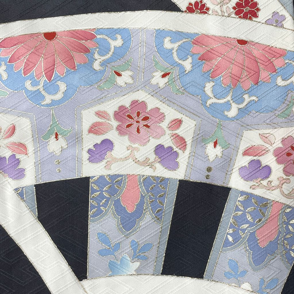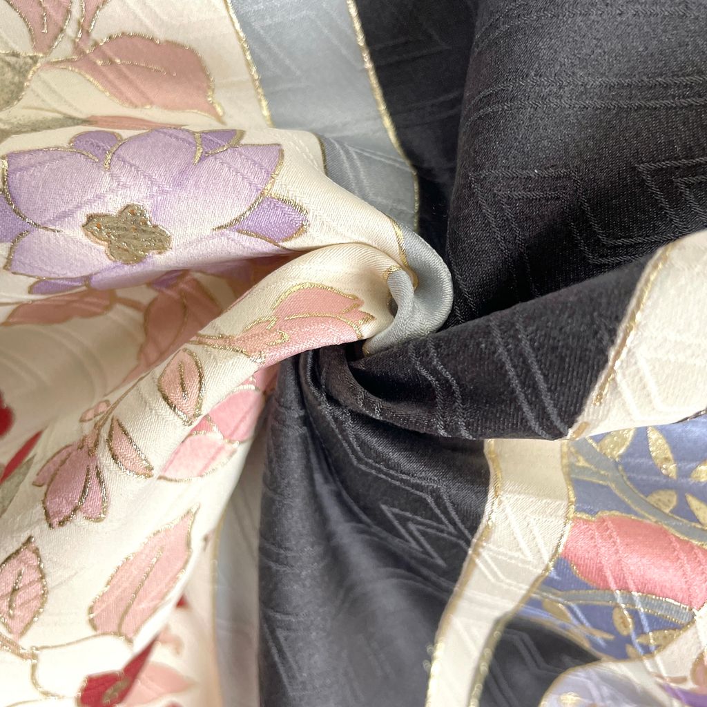 An elegant black furisode kimono crafted from luxurious pure silk, featuring a striking combination of floral and geometric patterns. The long sleeves and bold design make it ideal for formal occasions such as Coming-of-Age Day or wedding celebrations. A beautiful piece showcasing traditional Japanese artistry and textile craftsmanship.