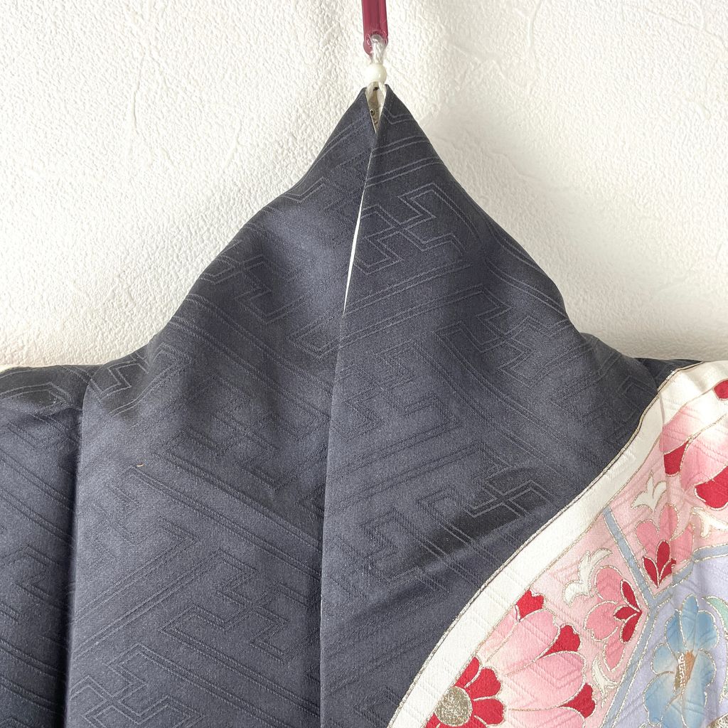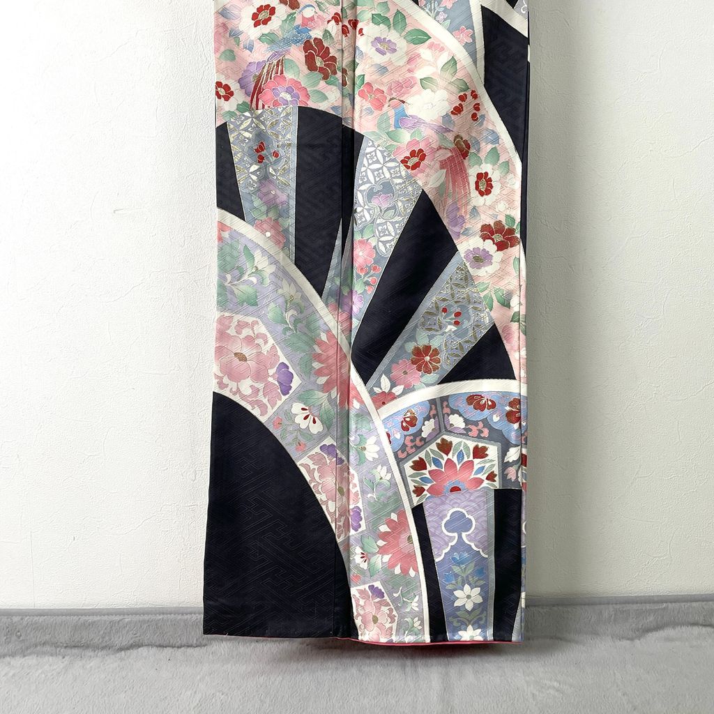 Vintage Black Furisode Kimono – Floral & Geometric Patterns – Pure Silk 5K4-3